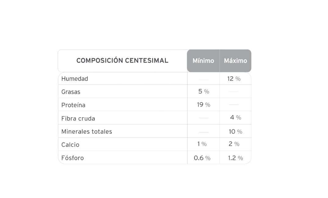 Harina carne res, harina carne pollo, trigo, maíz, germen de maíz, harina de soja, salvado de trigo, arveja, aceite de pollo, aceite de pescado (fuente de omega 3), zeolita, sal, conchilla, hidrolizado proteico de pollo, espinaca en polvo, dipropinato de calcio, ácido propiónico, colorante caramelo, amaranto, tartrazina, azul indigotina, rojo allura, rojo punzó 4R, BHT, BHA, núcleo vitamínico-mineral: vitaminas: A, D3, E, K, B1, B2, B6, B12, ácido fólico, ácido nicotínico, ácido pantoténico, biotina, colina; minerales:zinc, hierro, cobre, yodo, manganeso y selenio.