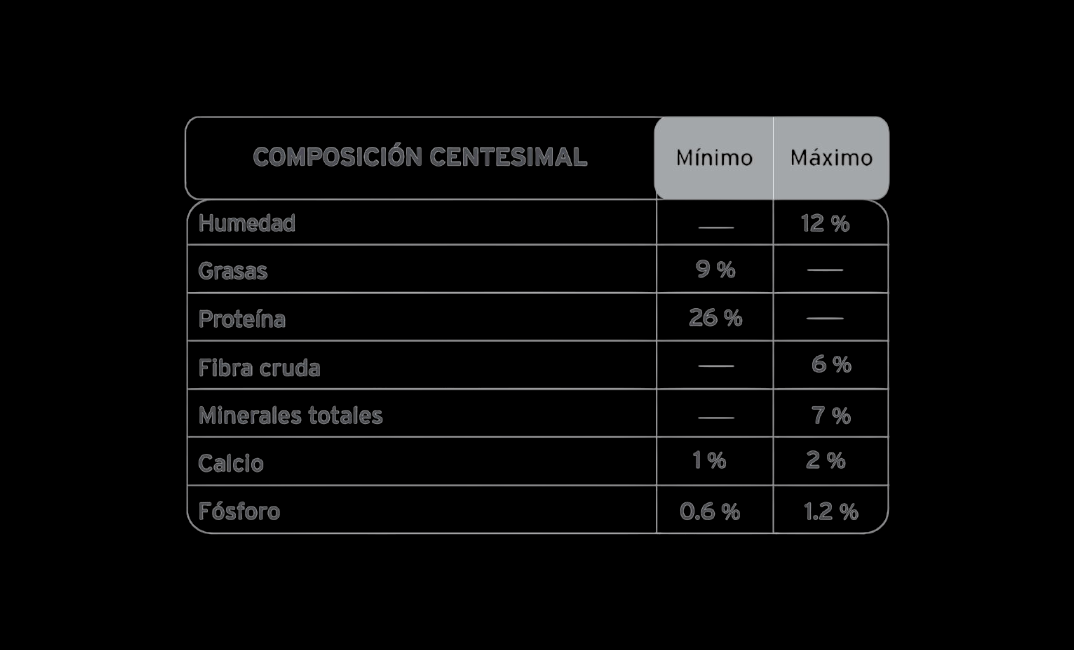 Harina de pollo, trigo, arroz, germen de maíz, gluten de maíz, aceite de pollo, harina de carne y hueso, hidrolizado proteico de pollo, aceite de pescado, sal, fosfato de calcio, zeolita, carbonato de calcio, dióxido de titanio, metionina, colorante caramelo, dipropionato de amonio, ácido propiónico, BHT, BHA, núcleo vitamínico mineral: vitaminas A, D3, E, K, B1, B2, B6, B12, ácido fólico, ácido nicotínico, ácido pantoténico, biotina, colina. Minerales: zinc, hierro, cobre, yodo, manganeso y selenio.